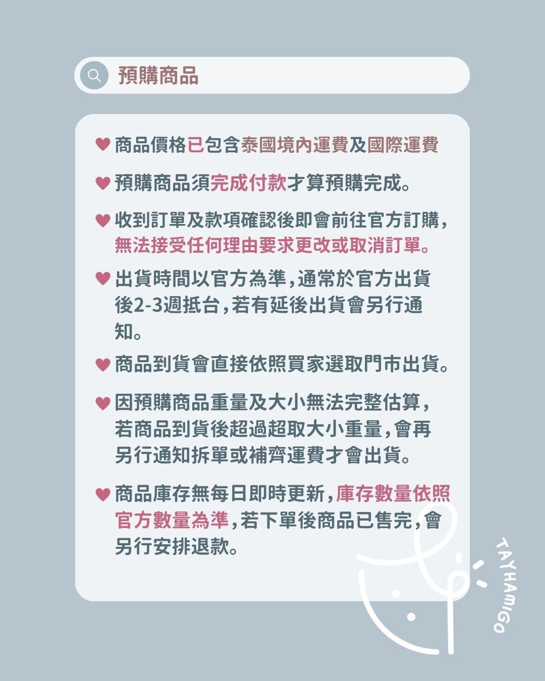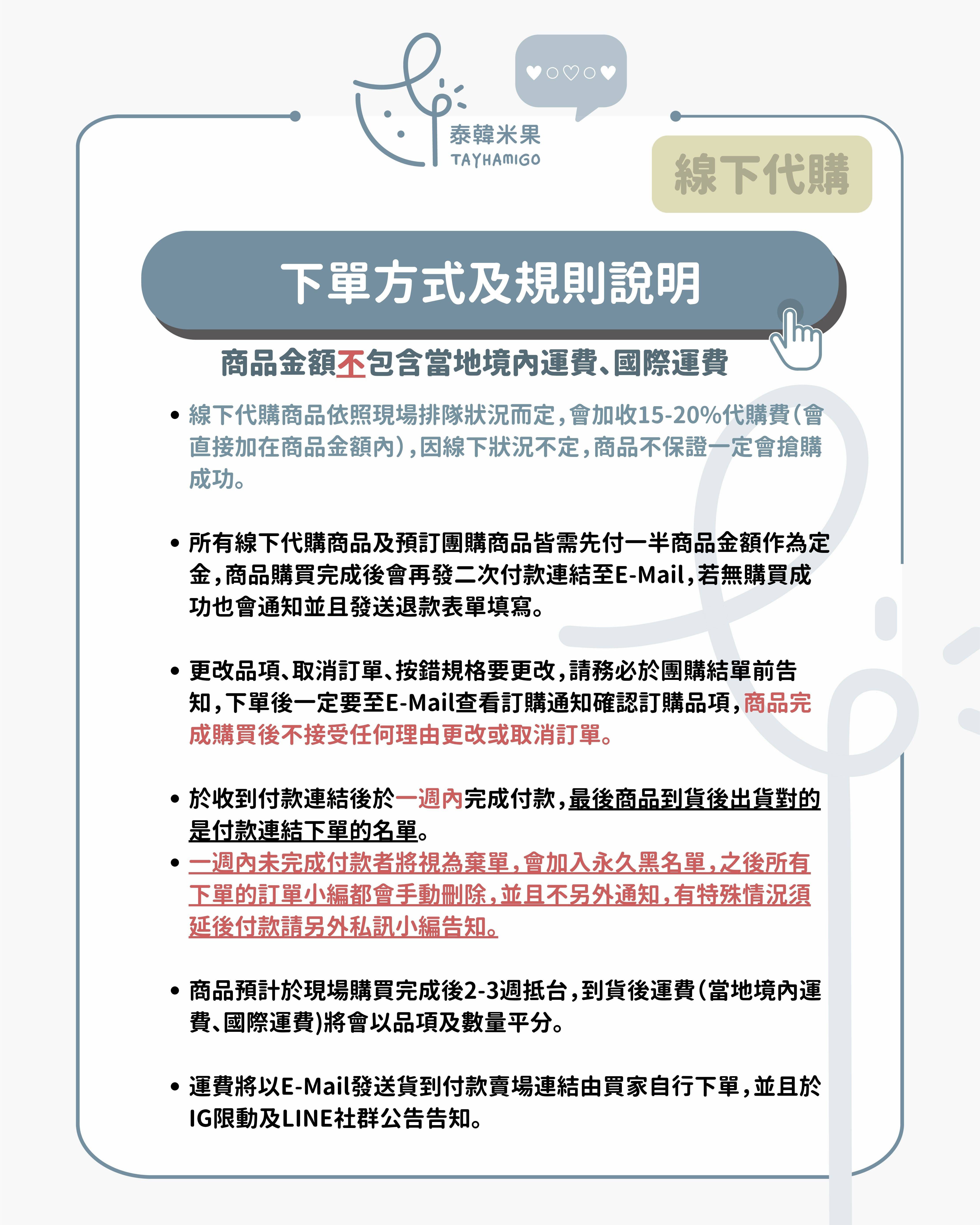 🔺以上規則之例外為買家有提前告知團購訂單需跟尚未到貨的商品合併出貨,商品將可幫忙保留。