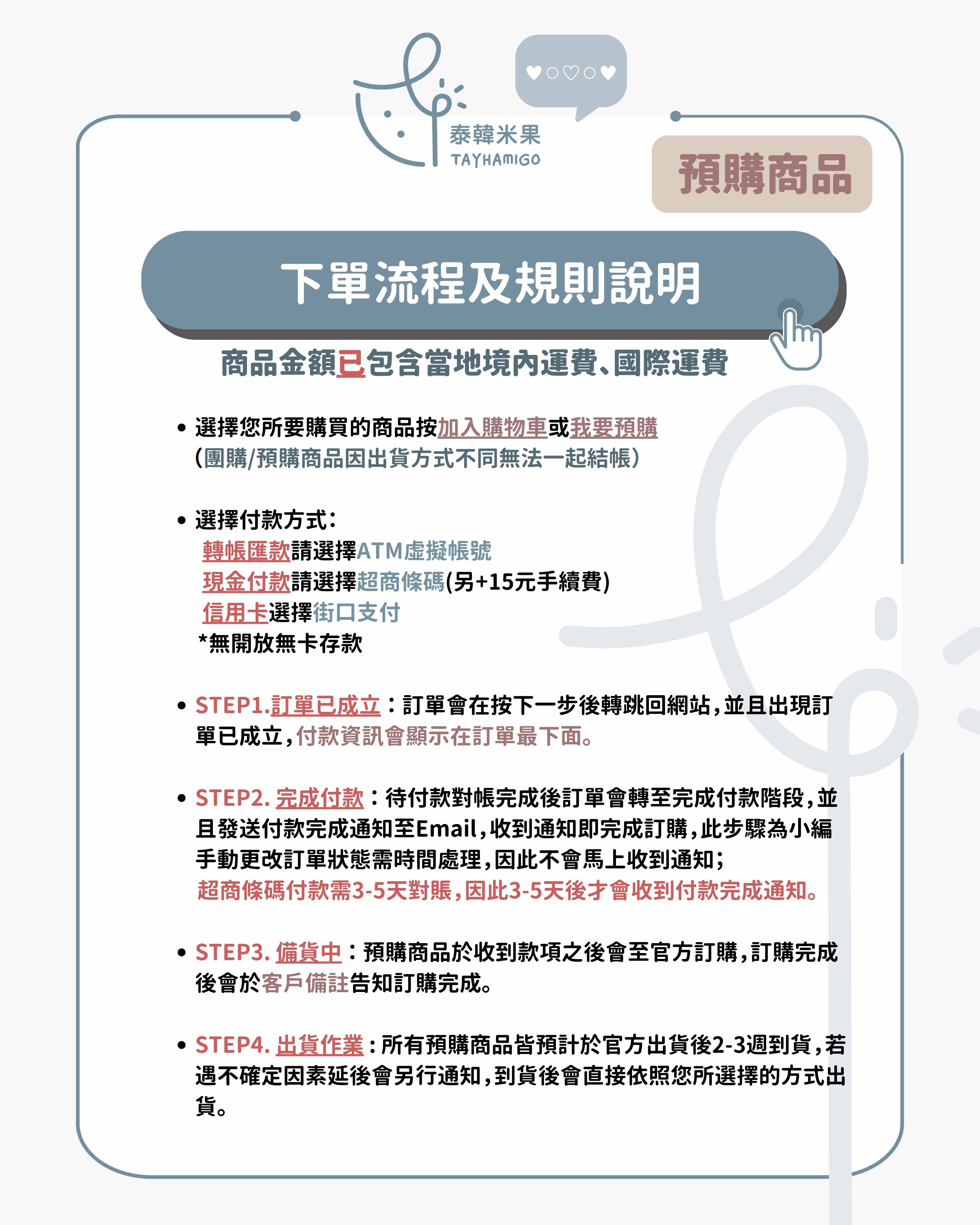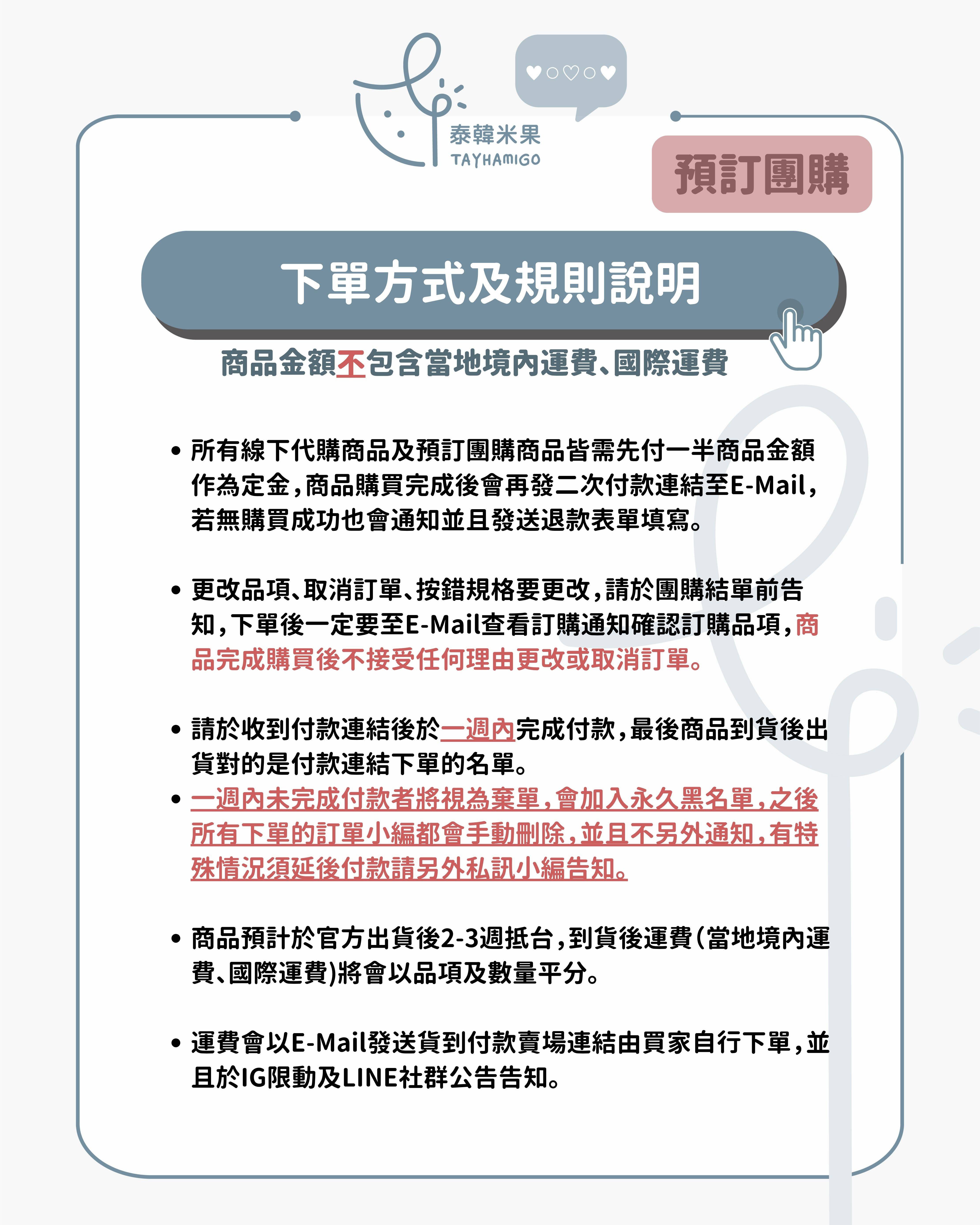 ❣️所有團購或預購商品皆預計於官方出貨後2-3周抵台,每項商品官方出貨時間不同,請下單前先確認是否可以等待到貨時間。