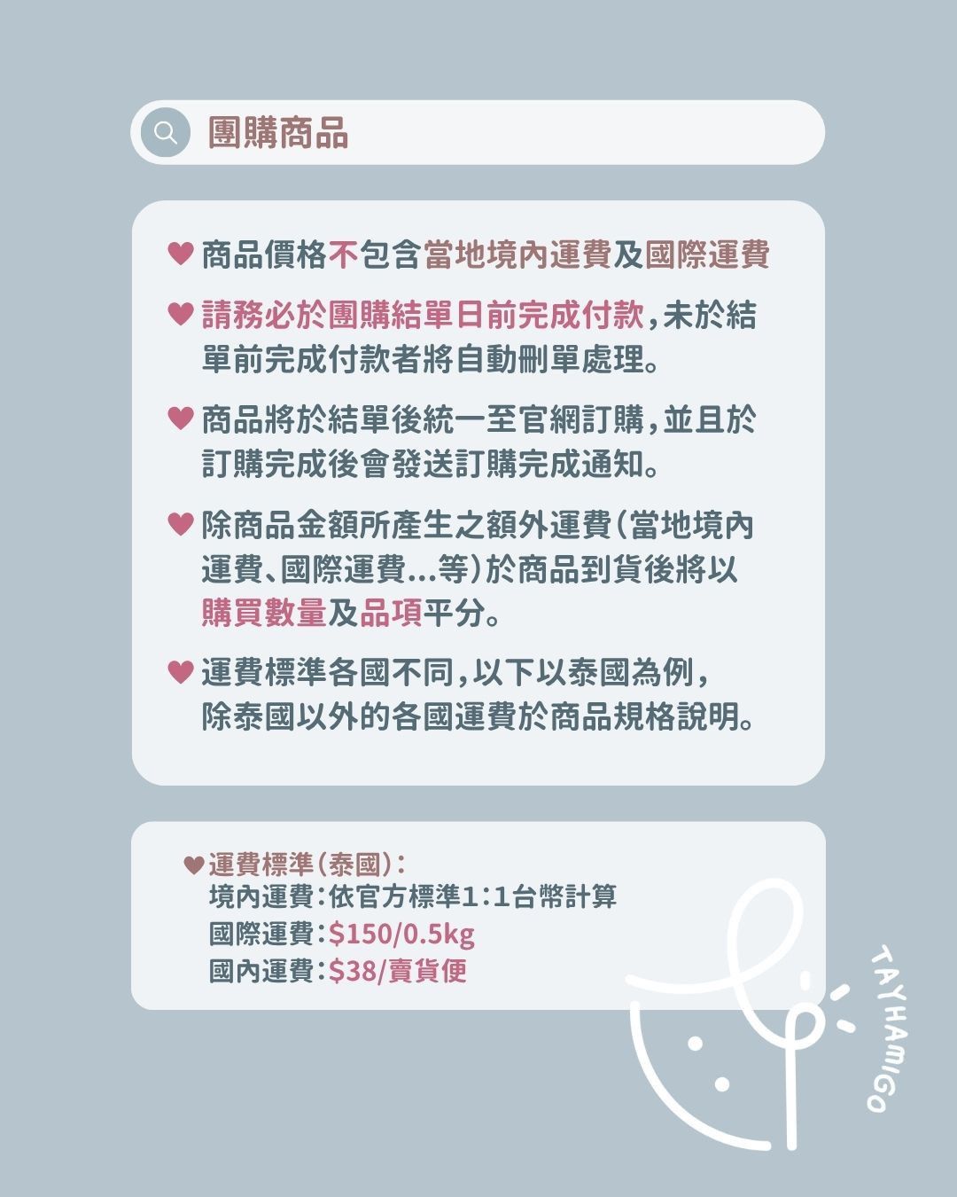 商品價格不包含所有除商品金額以外所產生之費用(當地境內運費、國際運費、國內運費),所有運費將於商品到貨後以品項及數量平分(每個團購分開結算)。因各國集運運費標準不同,以下以泰國為標準,若有不同運費金額會在貼文特別告知。